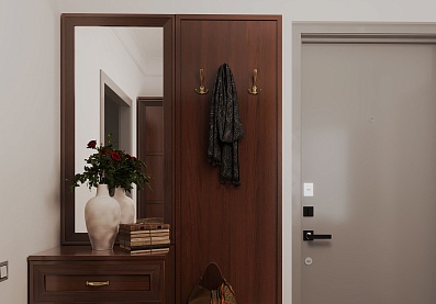 - В гостиной есть вся необходимая мебель для хранения: два напольных шкафа, два навесных шкафа, тумба с двумя выдвижными ящиками и две вместительные полки. Для самого важного всегда найдется место;