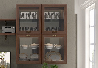 - На задних стенках шкафов со стеклянными вставками есть зеркала. Это помогает зрительно расширить комнату.
