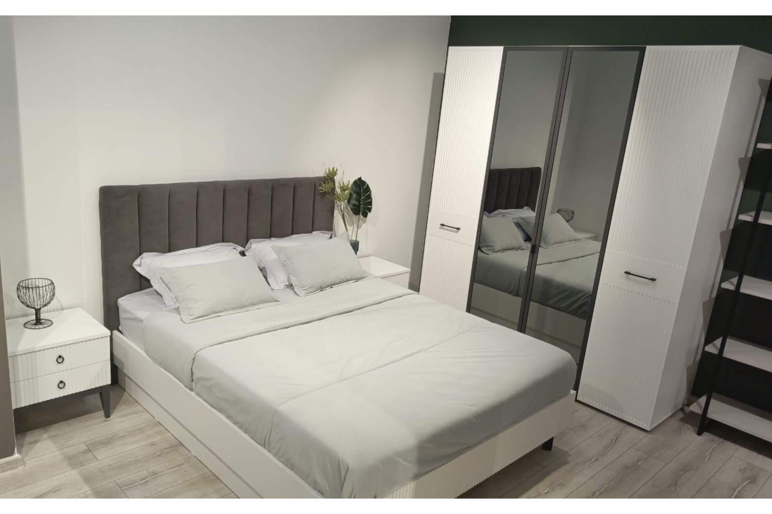 - Для хранения в спальне есть большой шкаф с зеркалом элегантного пепельного оттенка «графит», что придаёт дополнительный шарм коллекции;